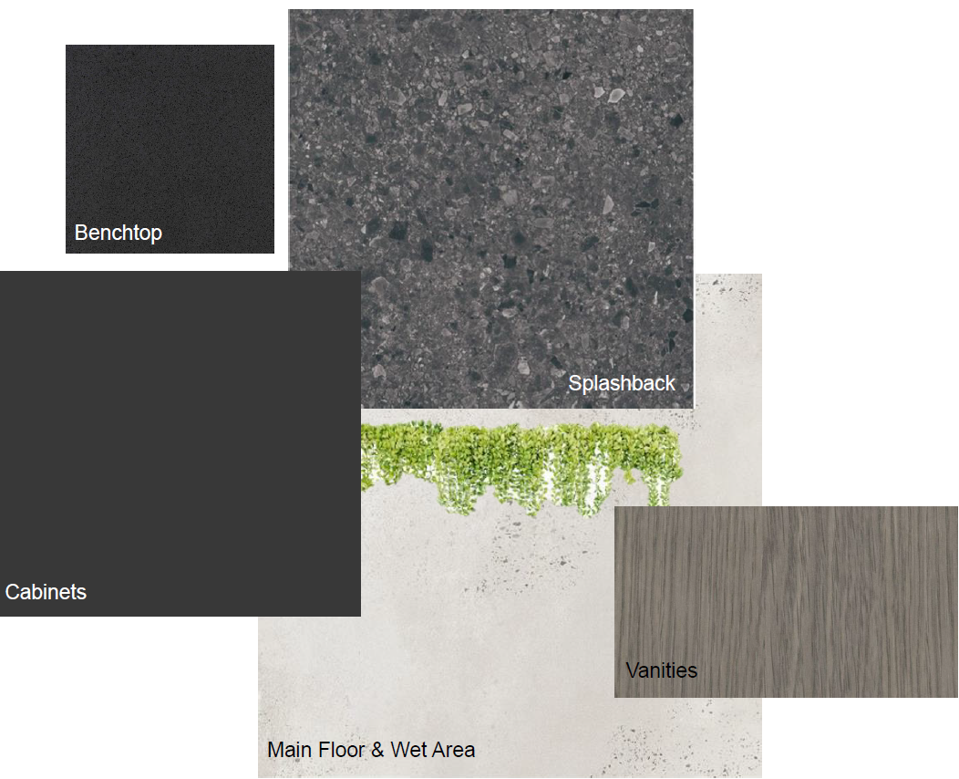 ✅ Main Floor & Wet Area Tiles: A soft concrete-look tile brings balance to the darker elements, ensuring the space feels open and airy while maintaining a contemporary aesthetic. We recommend a porcelain tile with a high slip rating for the bathrooms.
