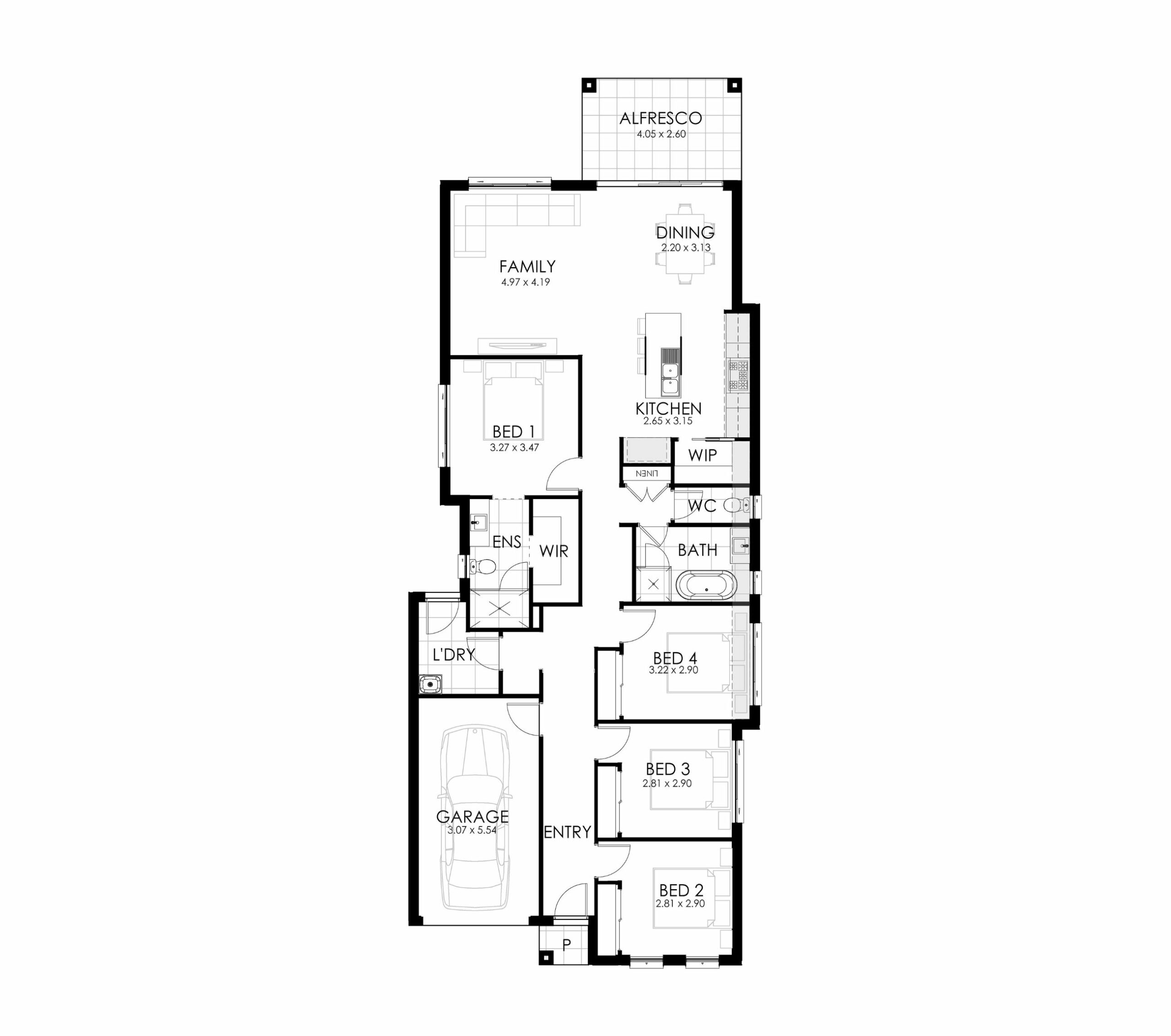 Spacious Bedrooms: This design features four generous bedrooms, ensuring ample space for the entire family. The main bedroom includes a luxurious ensuite and a walk-in robe, offering a private retreat for parents. Bedrooms 2, 3, and 4 are well-sized and include built-in robes for convenient storage.