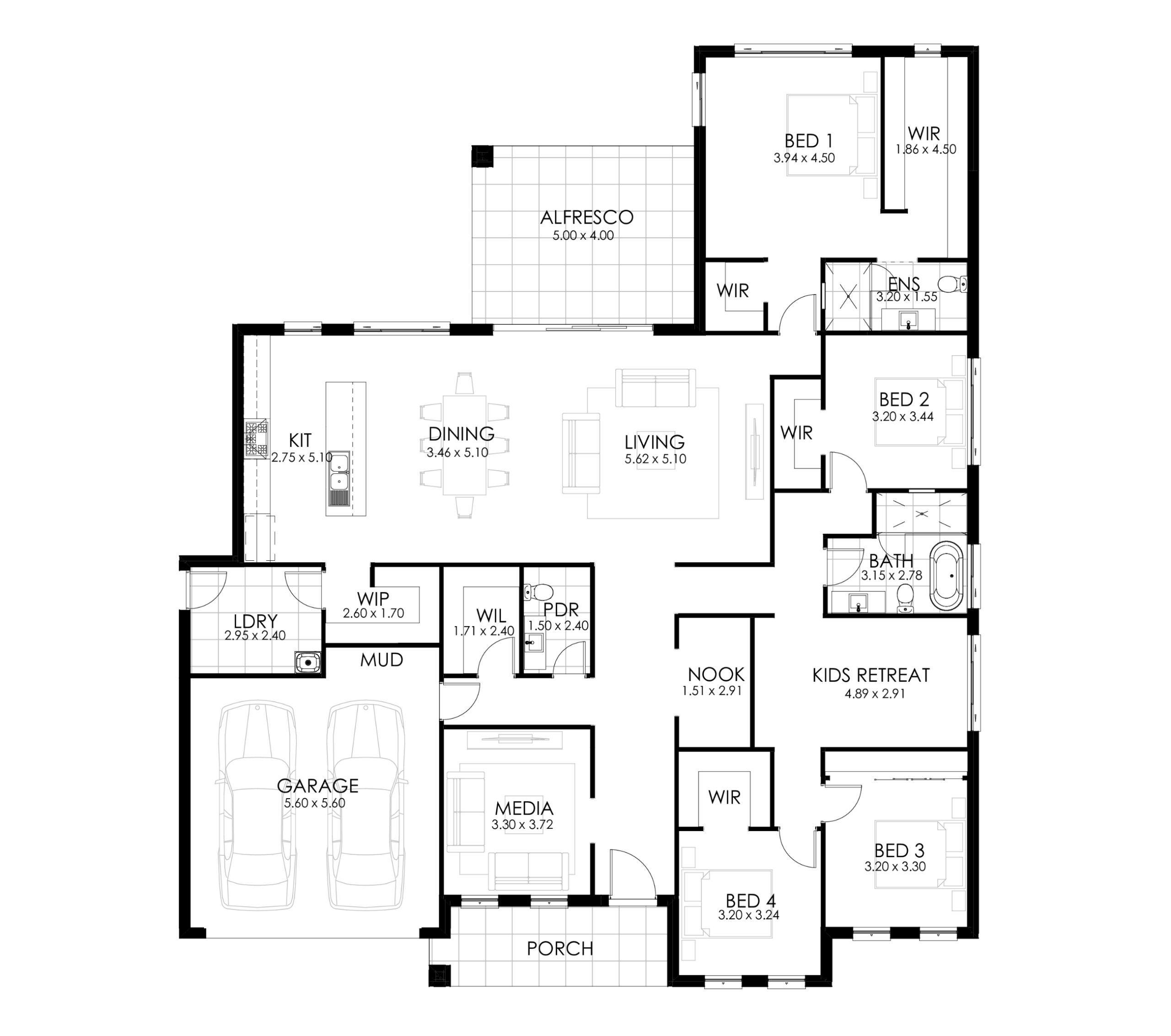 The Kingston features four generously sized bedrooms, all designed with comfort and storage in mind. The main suite includes a walk-in robe and a stylish ensuite, creating a private retreat for parents. The remaining bedrooms are located in their own dedicated wing of the home and also include walk-in robes, making them perfect for growing families who need space and storage.