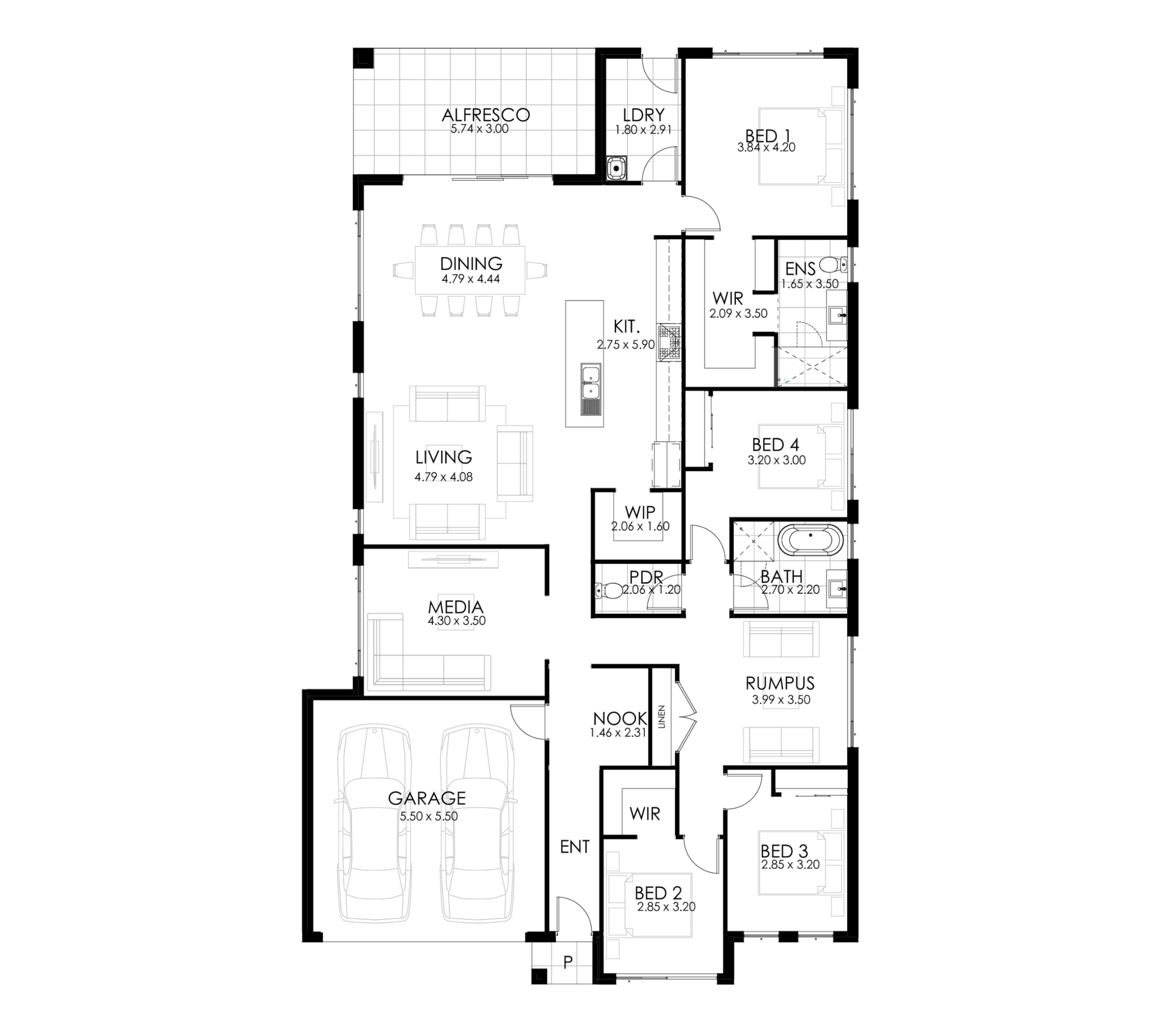 Spacious Bedrooms: The Sienna offers four well-proportioned bedrooms to meet your family’s needs. The main suite features a private ensuite and walk-in robe, providing a serene retreat for parents. Bedrooms 2, 3, and 4 are generously sized and include built-in robes for convenient storage.