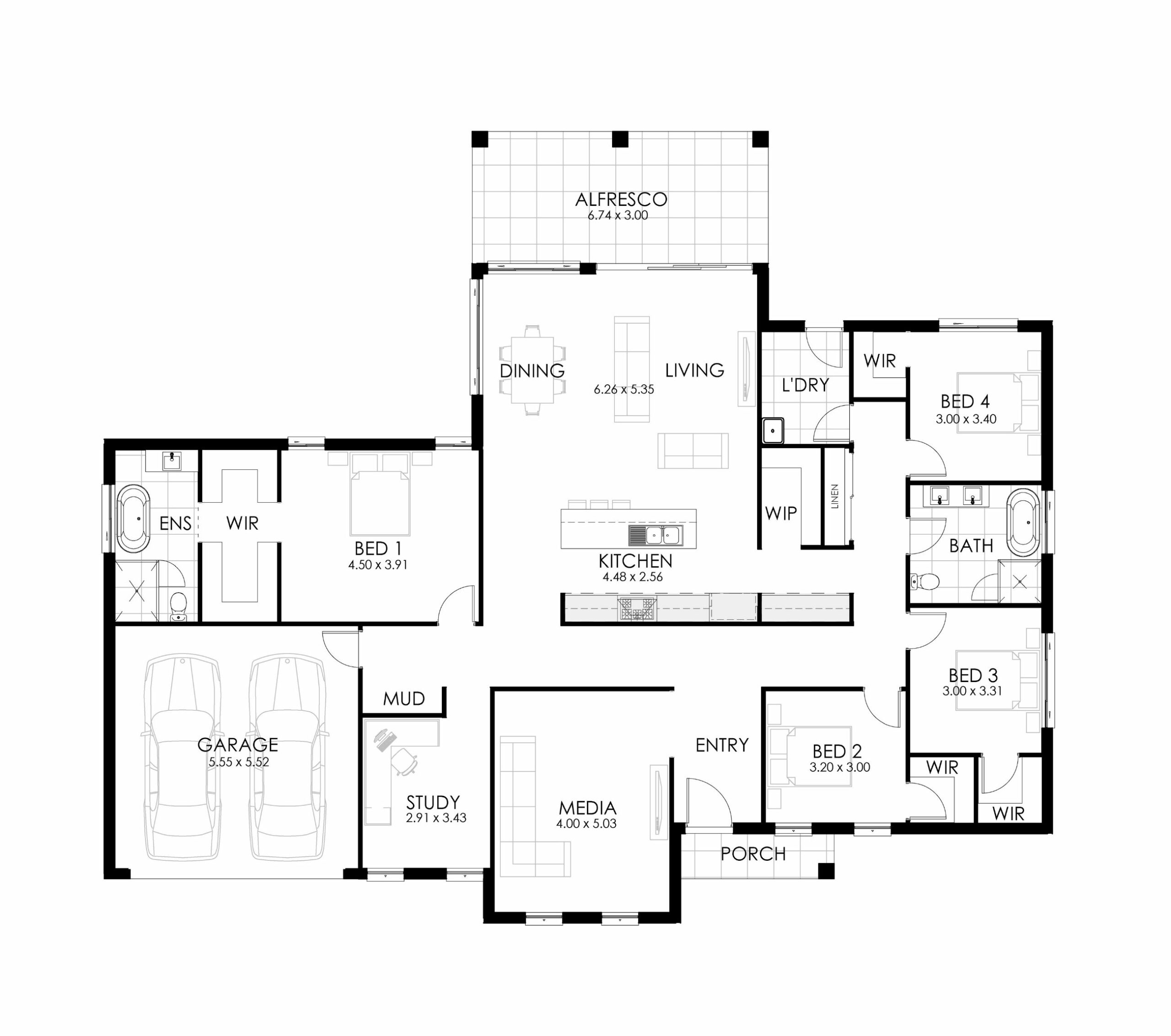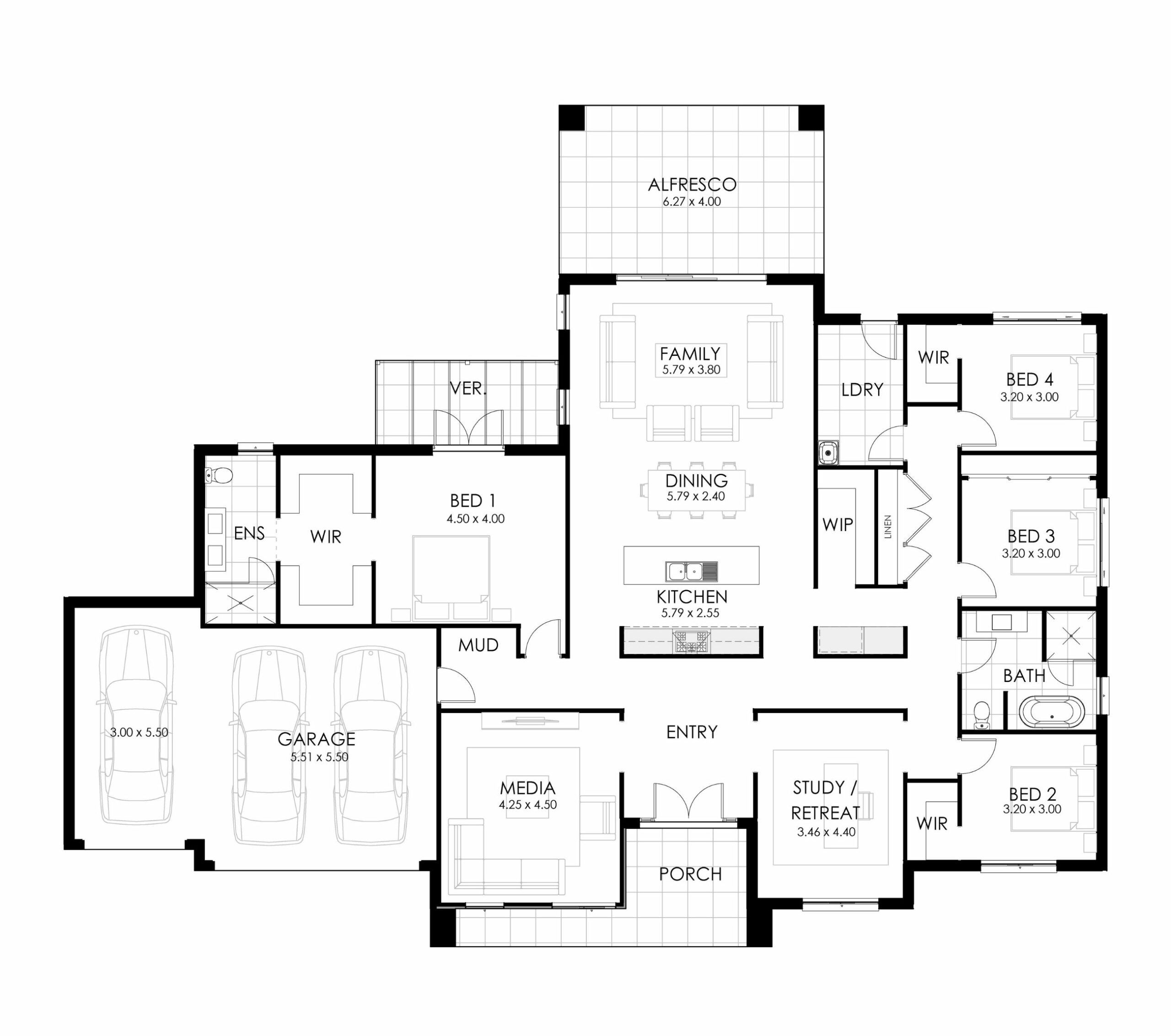 Spacious Bedrooms: This acreage home design boasts four generous bedrooms, ensuring ample space for the entire family. The main bedroom features a luxurious ensuite and a walk-in robe, offering a private retreat for parents. Bedrooms 2, 3, and 4 are well-sized and include built-in robes for convenient storage.